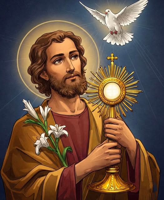 Oración: Oh Dios, que nos concediste el sacerdocio real; te pedimos que, así como san José mereció tratar y llevar en sus brazos con cariño a tu Hijo unigénito, nacido de la Virgen María, hagas que nosotros te sirvamos con corazón limpio y buenas obras, de modo que hoy recibamos dignamente el cuerpo y sangre de tu Hijo, y en la vida futura merezcamos alcanzar el premio eterno. Por Jesucristo nuestro Señor. Amén
