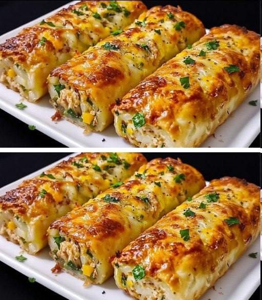 Estos rollitos de papa tienen una base firme, un relleno de pollo salteado con verduras y una cobertura dorada de queso fundido.