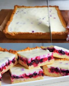 Esta receta celebra la versatilidad de las bayas, permitiéndote usar bayas de temporada o fáciles de encontrar, como grosellas negras, grosellas rojas, arándanos o frambuesas. El cremoso glaseado de crema agria y leche condensada realza la tarta, aportando un delicioso dulzor que combina a la perfección con la acidez de las bayas.